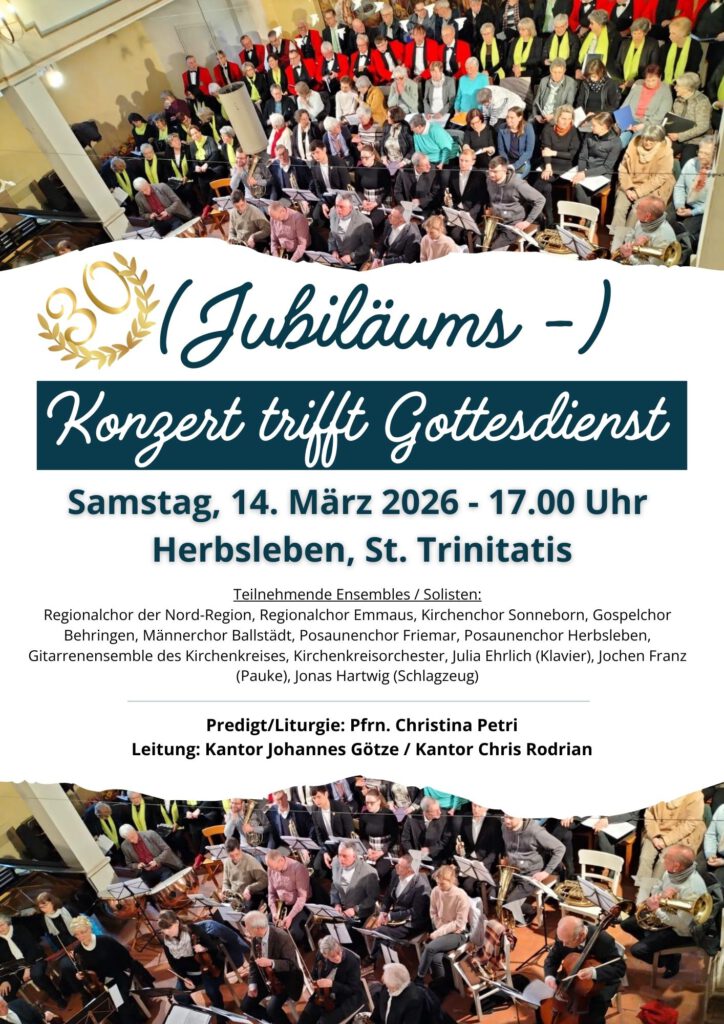 mit dem Behringer Gospelchor, dem Emmaus-Chor, dem Sonneborner Chor, dem Regionalchor Gotha-Nord, den Posaunenchören aus Friemar und Herbsleben, dem Kirchenorchester, dem Gitarren-Ensemble und Solisten.